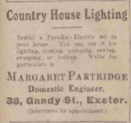 The war brought this job to an end but Margaret had the taste for engineering and turned her attention to the domestic uses of electricity, setting up her business in 1921. To generate more demand she set up an exhibition of electrical models and machines in Exeter to show how rural houses might feel with electric lighting and how this could be installed. There was also a display of labour-saving devices designed to get women excited. It had the desired effect, with the new business kept very busy, installing electricity in scores of private houses and three rural churches.