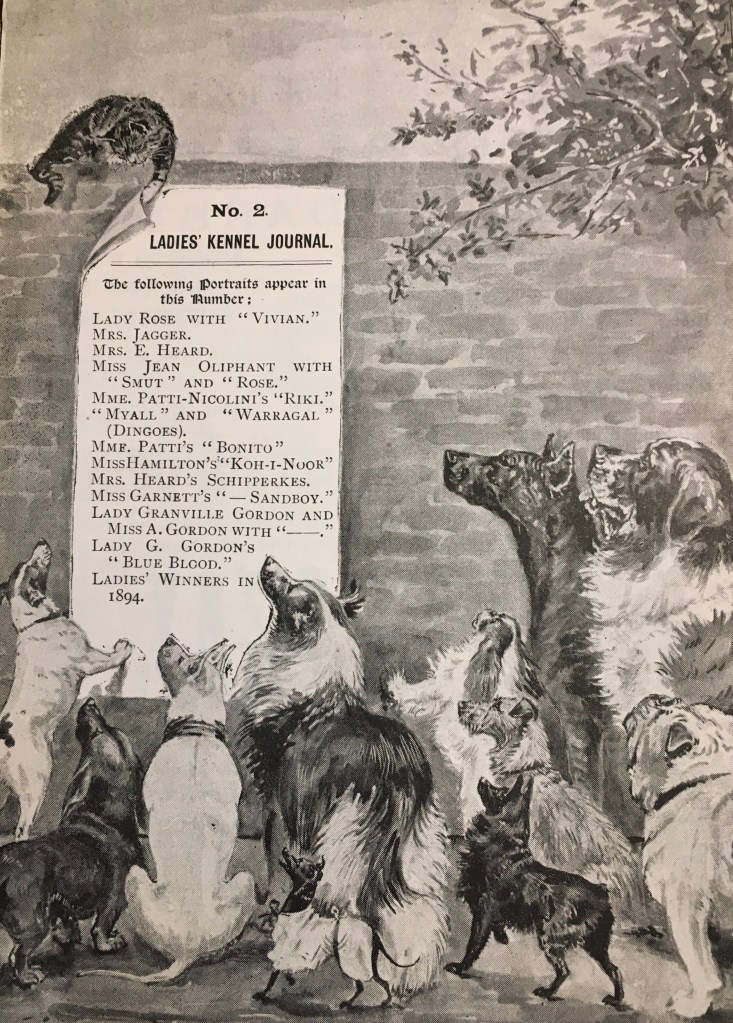 On 2nd November 1894 the front page of the Westminster Budget featured ‘Miss Mortivals’ (Myrtle) with four generations of dogs (there is a puppy centre bottom), bred by her mother. Inside was a long feature on Aliceโs kennel set up down in Essex. Soon after this she launched a magazine, the Ladiesโ Kennel Journal.