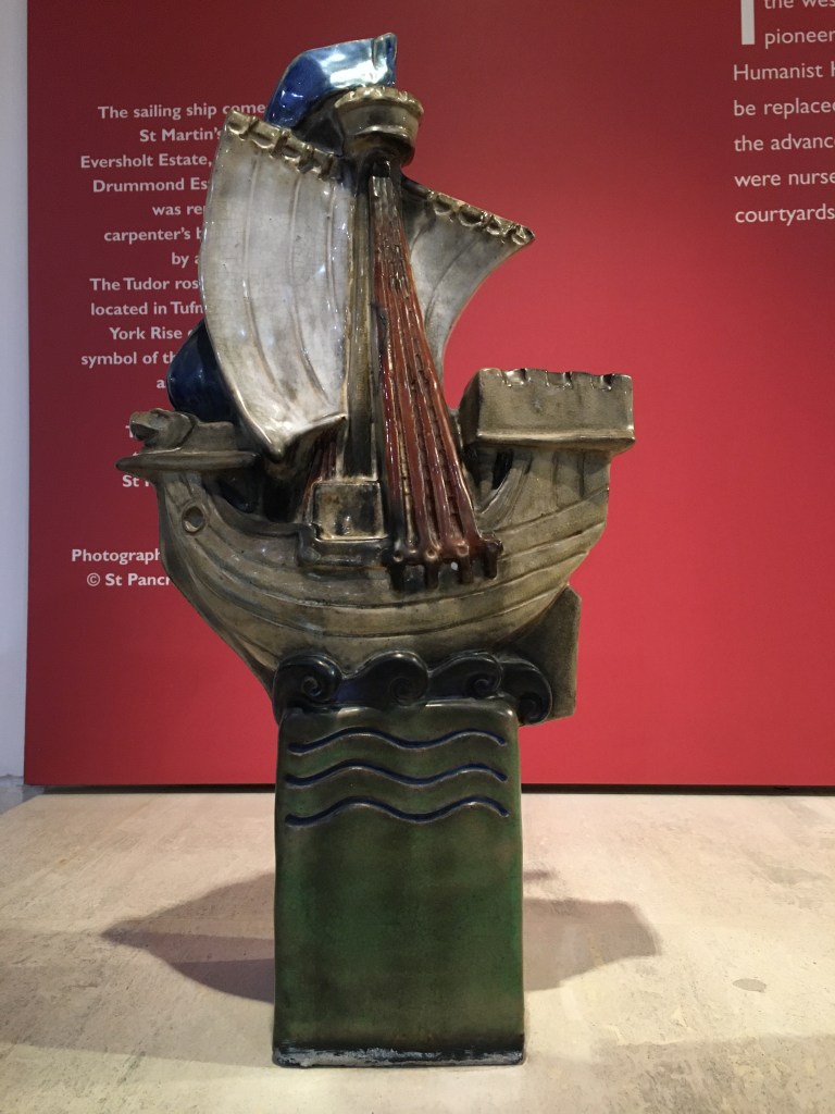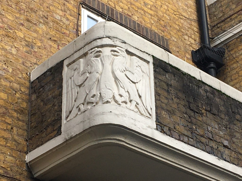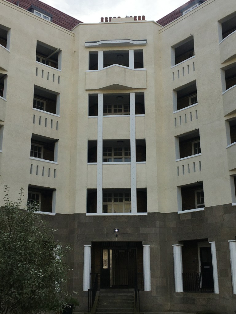 Gilbert Bayes (who also designed the famous Queen of Time Clock that still stands over the main entrance of Selfridges) made lunettes to go over some of the windows. The thoughtful approach to the design is best exemplified by the washing lines. Instead of the traditional wooden posts stuck into asphalt, which quickly rotted, a circular structure was created in building courtyards, with twenty-four concrete posts set around one central higher post so the washing lines radiated out from the centre like maypole streamers. Bayes designed glazed stoneware sculptures to adorn the posts that reflected the name or purpose of the building: the one outside the block that included the nursery school had twenty-four posts, on which were placed four and twenty blackbirds; other designs included ships and fish, thistles and roses.