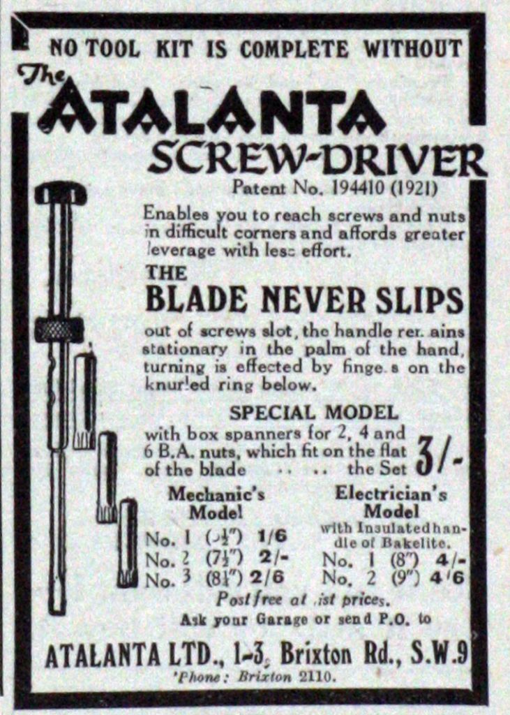 The early years were tough and orders were slow to materialise. In 1924, Atalanta scaled back and relocated to London, spending the next year operating out of smaller premises at 479 Fulham Road. In 1925 a large order for some special stamping work meant that they could move to larger premises at 1-3 Brixton Road and install a wider range of machinery. That year Annette was elected the first woman member of the Society of Engineers and in 1926 presented a paper on ‘Some products from a small machine shop’. They included a screwdriver that could be used with the hand staying in one place, with a mechanism for rotating the blade separately and a hairbrush where the bristles were on a detachable plate that could be removed for easy cleaning.