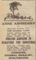 At the end of the 1930s, Annette embarked on a career as a designer and maker of miniature gardens and with the new direction came a different version of her name. Now calling herself Anne Ashberry, her gardens had tiny trees, miniature roses and cyclamen planted in bowls, concrete boxes and stone sinks. She based her business in South Kensington had two years to establish herself before the war intervened and she put on her overalls once more.